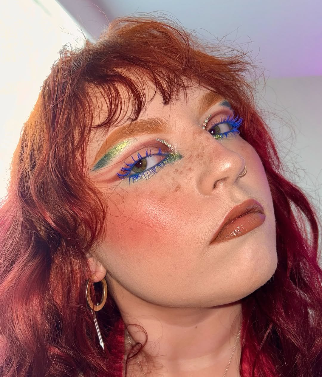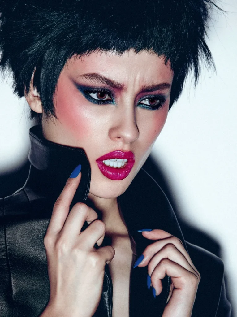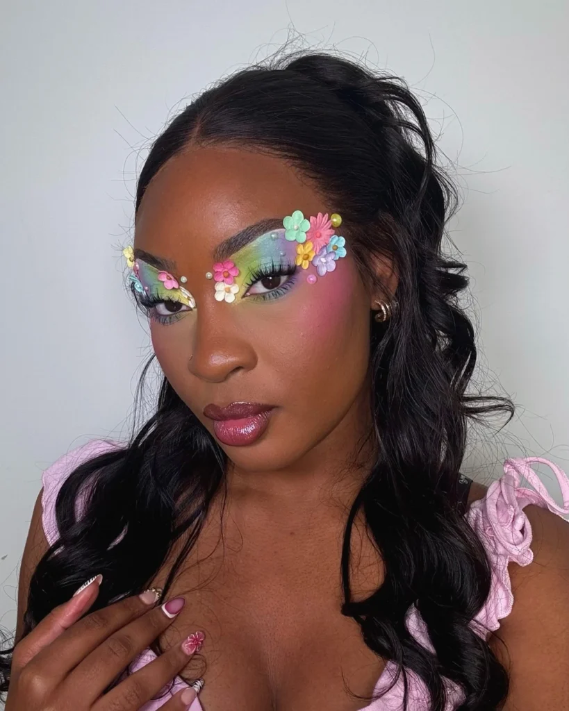 A maquiagem deixa de ser apenas cor e vira textura. O uso de sombras metálicas, glitters e pedrarias eleva o visual ao status de acessório de moda, unindo a nostalgia vibrante dos anos 2000 a um acabamento atual, mais tecnológico e refinado.